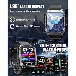 🏃Rugged Outdoor Sports Watch- Smart watch is made of superior material with IP68 waterproof, shockproof, magnetically resistant, which designed for professional outdoor exercise. Strong and anti-fall, built-in components will not be damaged by vibration. In addition, the watch touch screen is fully enclosed with an ultra-thin shell design with 1.96’’HD colorful large screen and 240*282 resolutions to bring you a better visual experience.