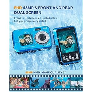 【Innovative Dual-screen selfie design & Fill Light】- The waterproof camera has Dual-screen design for easy selfie taking. The 1.7-inch HD display on the front can meet your self-portrait needs, and the 2.8-inch HD display on the back allows you to observe the subject more clearly during shooting. The fill light can provide you with more even light under low lighting conditions. 2s/5s/10s timing shooting function makes it more convenient for you to take photos of yourself or others.