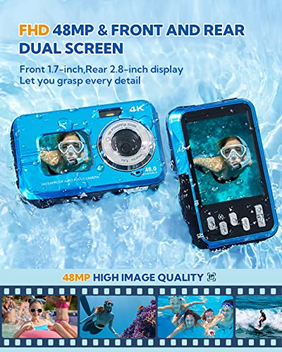 Underwater Camera, 4K 48MP Autofocus Waterproof Digital Camera with Selfie HD Dual Screens, 11FT 16X Digital Zoom Waterproof Camera with 64GB Card, Fill Light Underwater Camera for Snorkeling